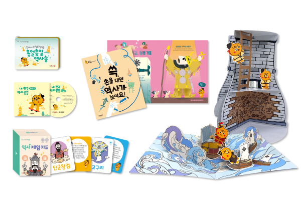 또한 단순한 읽기 경험을 넘어 아이들이 역사와 능동적으로 친해질 수 있도록 풍성한 놀이 패키지를 함께 제공한다. 유물과 유적을 자세히 살펴보는 역사 놀이책(1권)과 키워드를 재미있게 익히는 역사 게임 카드(100장)로 학습 효과를 높이고, 거북선이나 수원 화성 등을 직접 만들어 보는 유물·유적 북아트(8종)와 연표 포스터·스티커를 통해 역사의 흐름을 시각적으로 파악할 수 있다. 여기에 주요 역사적 사실이 입에서 저절로 맴도는 역사송 CD와 카드를 더해 지루할 틈 없는 학습 환경을 조성한다.